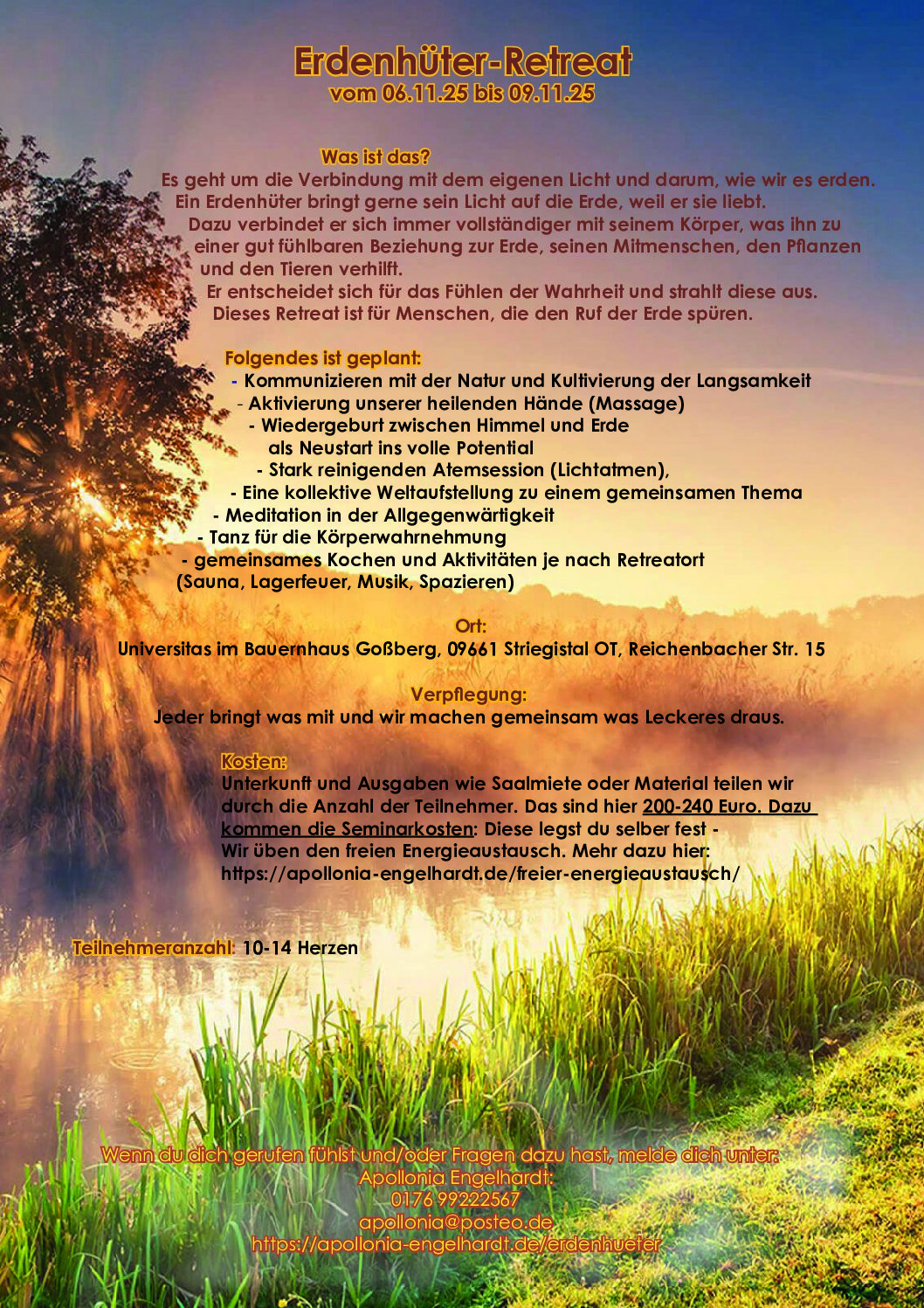 Wenn ein Erdenhüter dafür geeignete Wörter findet, die oft magisch oder mystischen Ausdruck haben und dennoch mit Schlichtheit bezaubern, dann fungiert er als Brücke und als Übersetzer. Allerdings bedarf die goldene Spur nicht unbedingt der Worte. Wir arbeiten über Authentizität, Ausstrahlung und liebevolles verbindungsorientiertes Handeln.
